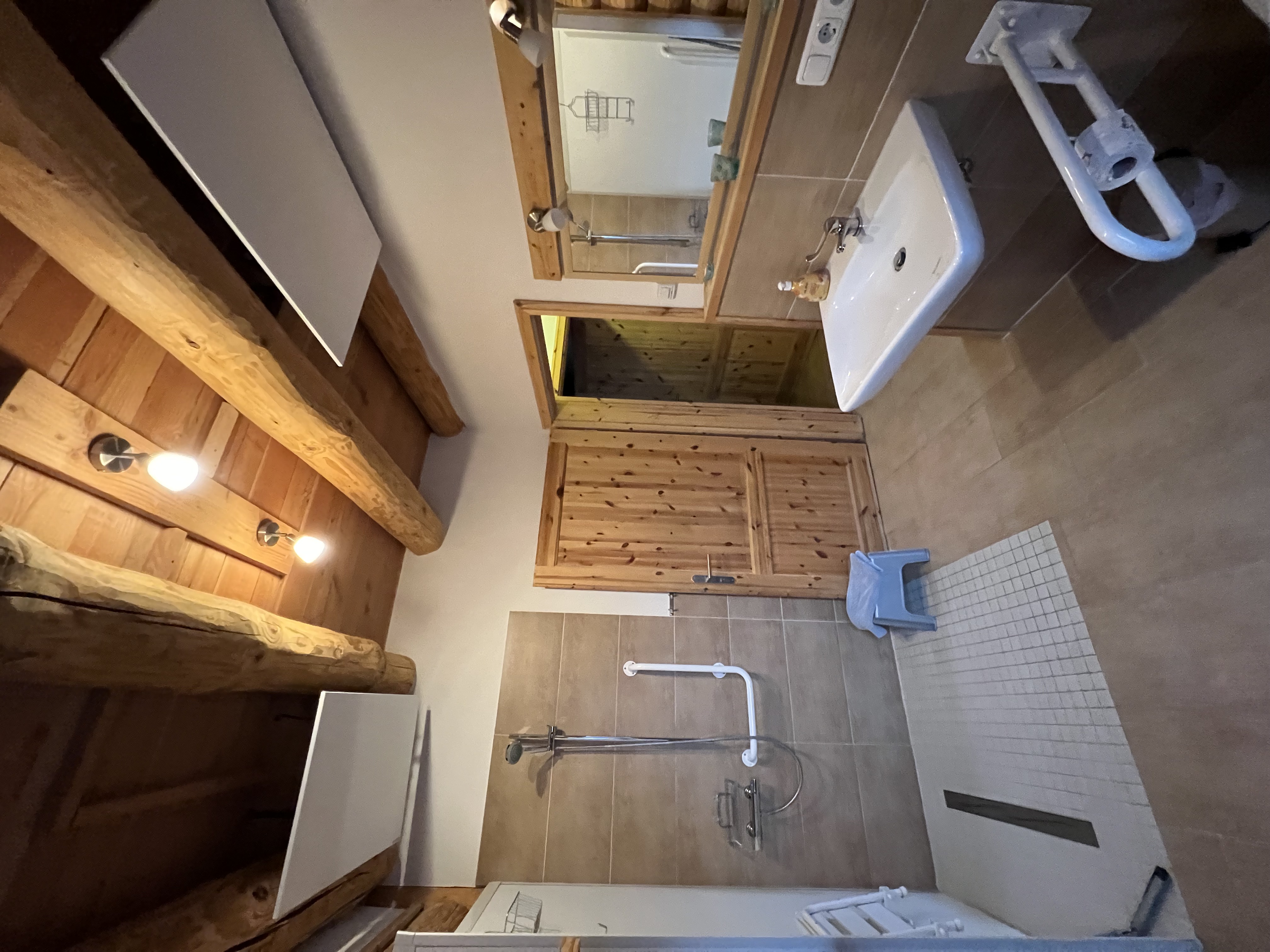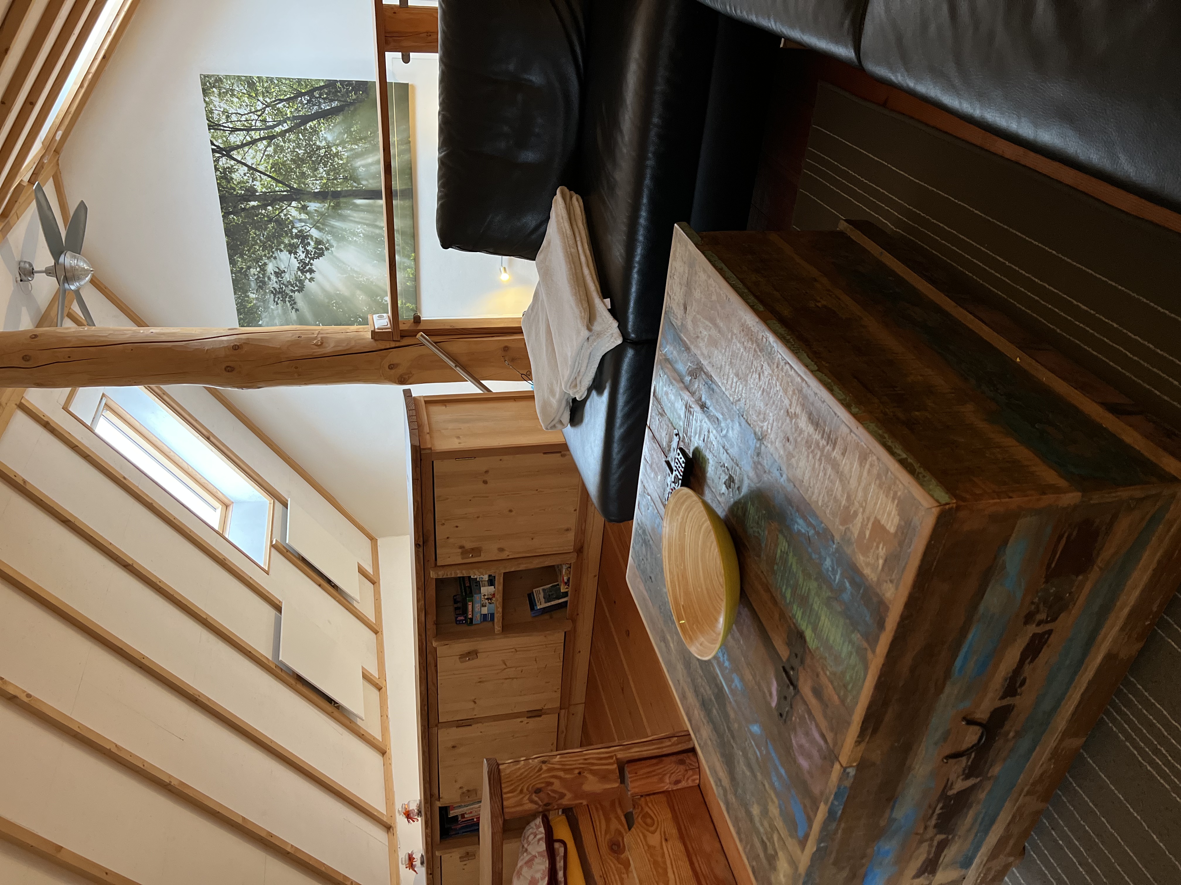 Im Untergeschoss befinden sich eine Wohnküche, ein barrierefreihes Bad, ein Gäste-WC und ein Schlafzimmer mit Doppelbett. Die Emporen bieten zusätzlich noch einen weiteren Schlafbereich für 2-4 Personen.