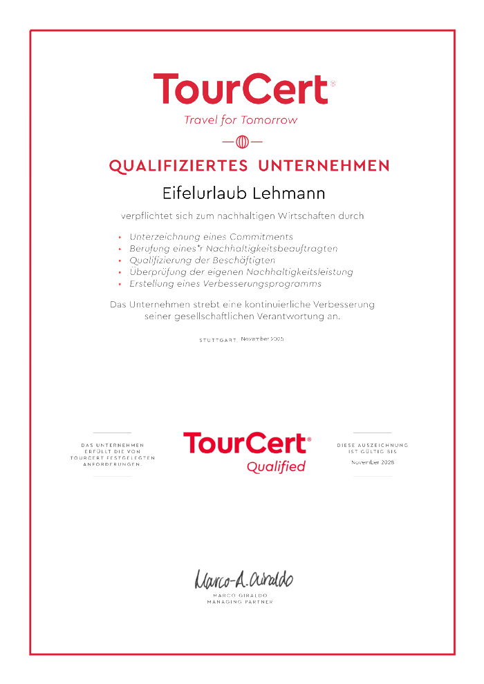 Die Nordeifel ist offiziell als nachhaltiges Reiseziel von dem renommierten Zertifizierungsunternehmen TourCert gGmbH ausgezeichnet worden. „Damit zählt die Region zu den Vorreiter:innnen für sanften, verantwortungsbewussten und zukunftsorientierten Tourismus in Deutschland“, so Landrat Markus Ramers, Vorsitzender der Gesellschafterversammlung der Nordeifel Tourismus GmbH (NeT), stolz. Die Zertifizierung der Destinationsmanagement-Organisation zeichnet großes Engagement der Geschäftsstelle und der Region im Bereich ökologischer, ökonomischer und sozialer Nachhaltigkeit aus.